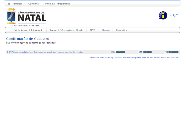 5. O link que o solicitante clicou no passo anterior irá redirecioná-lo (em nova janela) para a página confirmação de cadastro(figura abaixo);