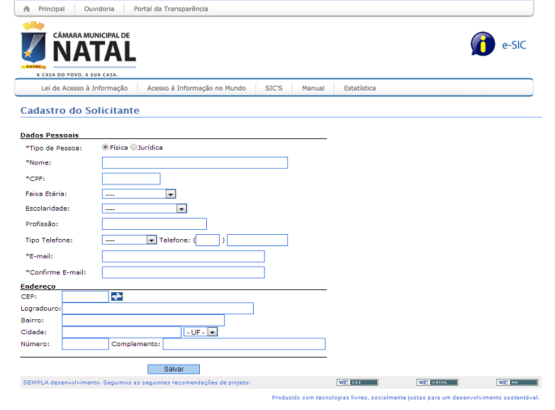 2. A tela seguinte é a de cadastro do solicitante, nela o usuário irá preencher os dados pessoais e em seguida clicar no botão salvar para que o seu cadastro seja efetuado (figura abaixo);