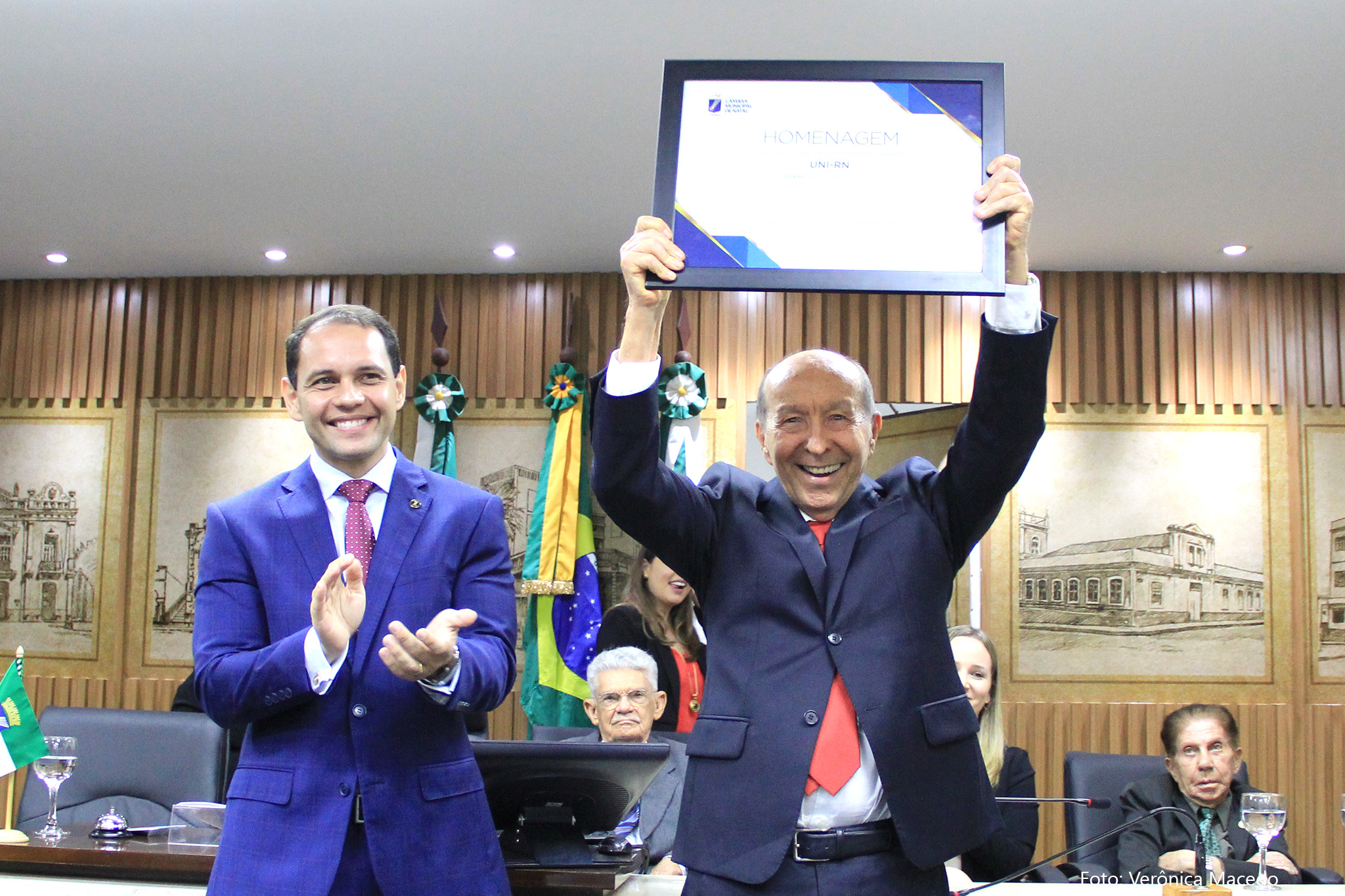Também entre os agraciados com a horaria do Legislativo natalense, Linduarte Leitão de Medeiros Brito, fundador e primeiro presidente do DCE da universidade, agradeceu ao parlamento municipal pela realização da solenidade. "Passa um filme na memória, pois foram momentos marcantes na vida de todos que estão aqui. Tivemos a oportunidade de testemunhar o nascimento de um dos mais relevantes centros universitários do Brasil. Aproveito para expressar minha gratidão à Câmara de Natal por celebrar conosco 20 anos de vitórias".