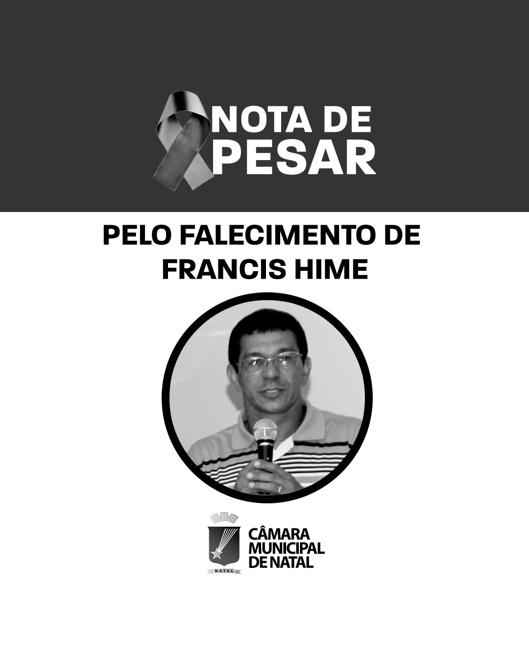 Neste momento de dor, o presidente da Câmara Municipal de Natal, Eriko Jácome, em nome dos vereadores, vereadoras, e servidores da CMN, manifesta profunda consternação e solidariedade à família, amigos e colegas de trabalho no gabinete do Vereador Peixoto, onde Francis Hime exercia a função de assessor parlamentar.