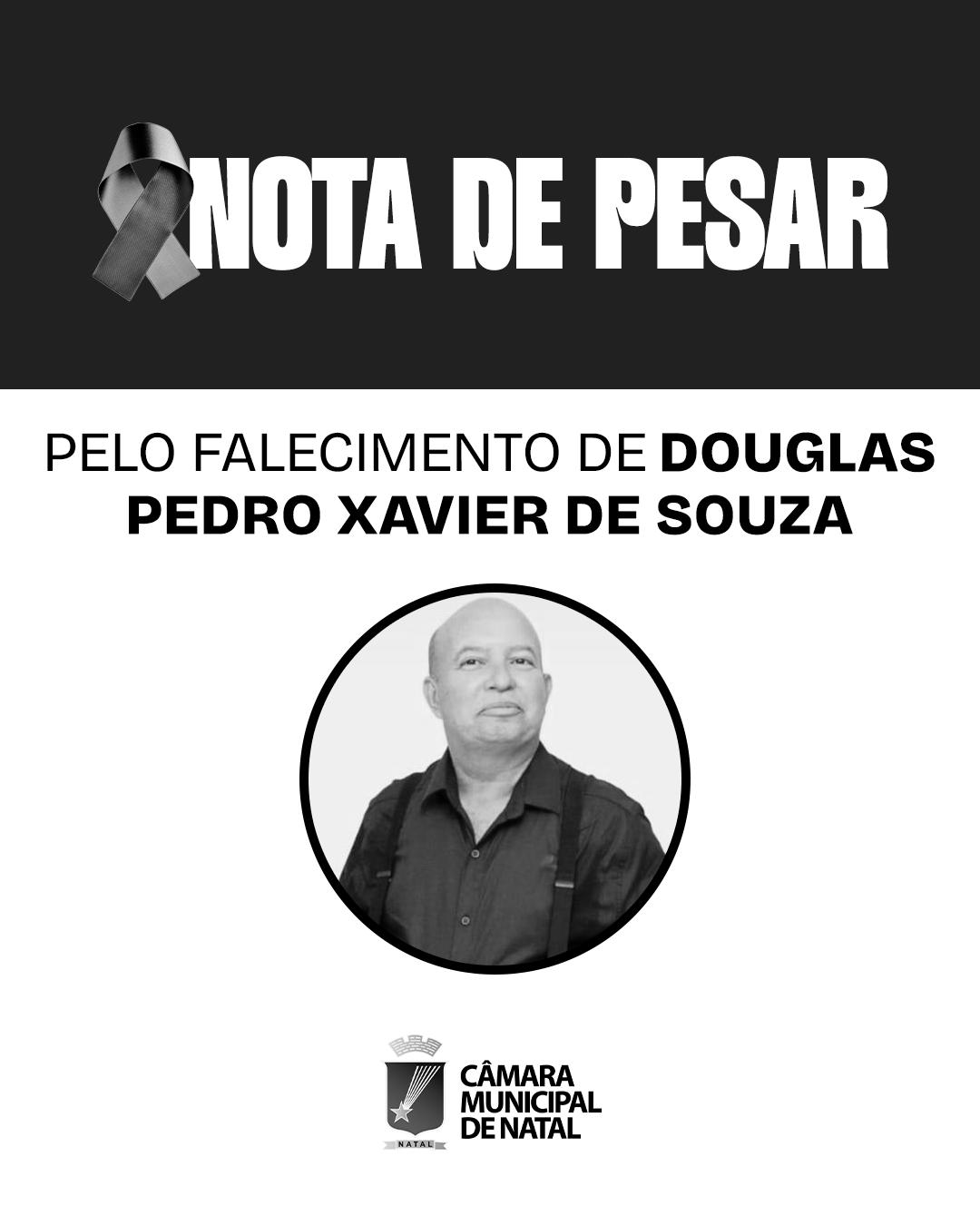 Com muito pesar, a Câmara Municipal de Natal, por meio de seu presidente Eriko Jácome, manifesta profundo sentimento de tristeza pelo falecimento do servidor Douglas Pedro Xavier de Souza, ocorrido neste domingo, 8 de fevereiro de 2026.